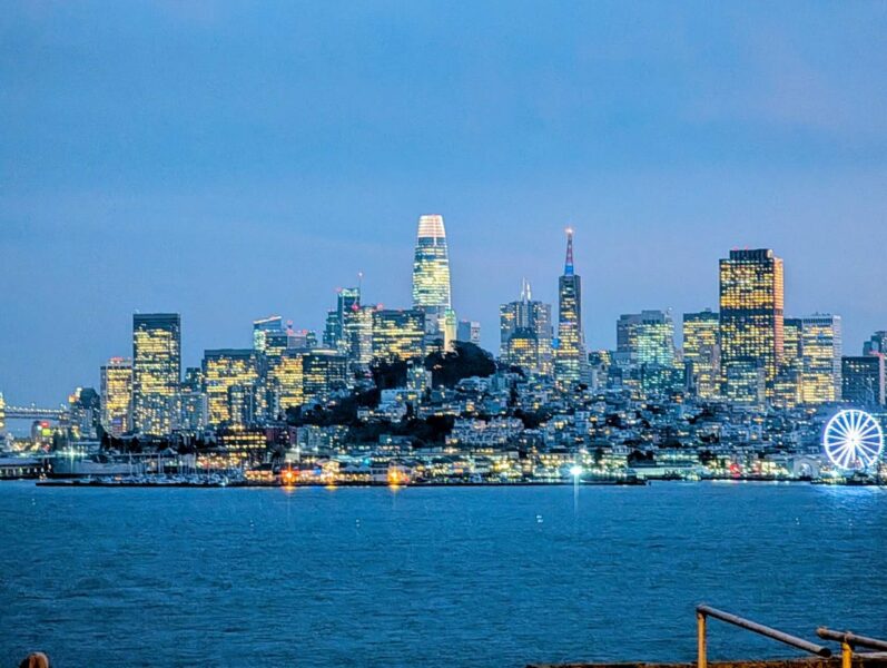 站在塔顶的观景层,旧金山在脚下展开:陡坡像层层石阶,街区像棋盘格一样向海延伸,远处的金门大桥、海湾大桥、轮渡大楼、甚至恶魔岛都尽收眼底。这座城市在地面看起来杂乱,但从高处看却意外地有秩序、有脉络,像某种混乱中的几何美感。