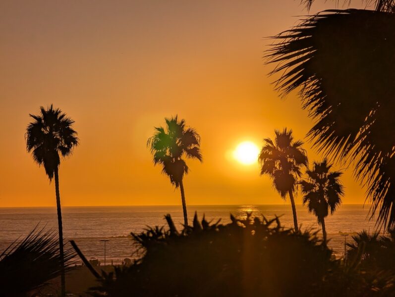 我到的时候正好赶上日落。金色的阳光透过一排排 棕榈树 的叶片洒在沙滩上,整个天空被染成了紫金两色,海面像被天边融化的金子浸透,连远处的摩天轮都闪着柔和的橙光。那一刻我几乎有点恍惚,好像自己走进了好莱坞电影的场景。