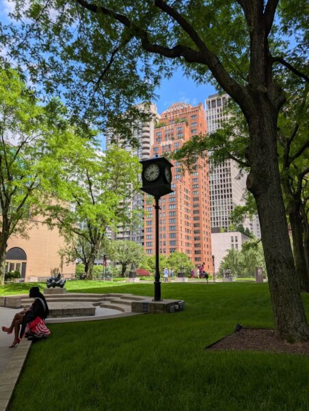 这一点后来我和那位一直留在纽约、喜欢画画的老友坐在纽约公共图书馆后面的 Bryant Park 时又提起过。他也同意这种说法。那是个温柔的夜晚,晚风刚好,草坪在探照灯的映照下泛出近乎梦幻的翠绿,几台自动割草机在上面静静地穿梭,仿佛一群无声的夜行者。人群稀疏,咖啡的香气混着树叶的味道,我们靠在长椅上聊起各自的生活。