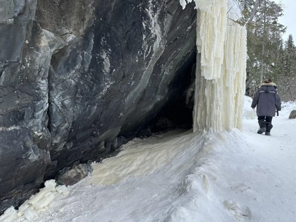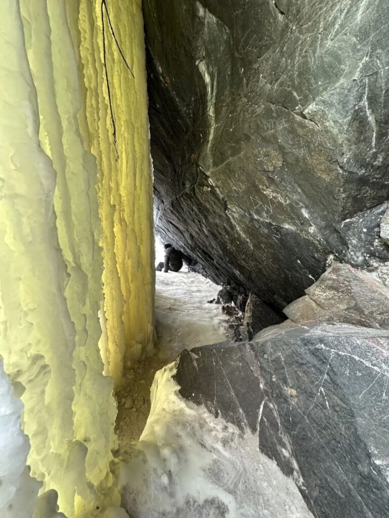 除了冰湖,我們還尋訪了兩處與冰雪有關的去處,其一是「冰洞」。在聽到這個詞時,我腦海中浮現的是新西蘭福克斯冰川(Fox Glacier)那種氣勢磅礴、足以容人穿行的巨型藍洞,因為上次沒去成冰川,心中滿是期待。然而,當我頂着寒風穿過凍湖,爬過濕滑難行的山徑,甚至路過了黃刀鎮的第一座墓地後,眼前的冰洞卻讓人啞然失笑:它不過是山崖上垂落的一排冰柱,像一堵剔透的牆扣在山脊邊緣,兩者間擠出的狹小縫隙勉強湊成了一個「洞」的形態,全長不過五米。這種規格的景點,確實讓人哭笑不得。