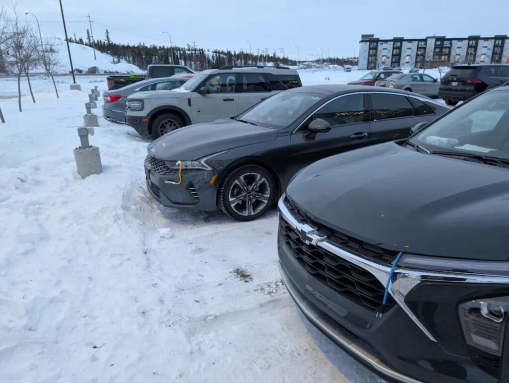 我穿了新買的加拿大鵝、兩條厚褲、厚襪,外加當年在北海道看雪時攢下的雪地靴,依然抵擋不住這極地透骨的寒冷。當我佇立在結冰的湖面,仰望那輪過於耀眼的弦月與仍然璀璨的星空時,能清晰地感覺到寒氣正像無數只爬蟲,順着腳底一寸一寸爬上我的雙腿。起初是雙腳失去知覺,隨後寒意擊穿了腿部的馬奇諾防線,逐漸攻陷小腿、膝蓋。那一刻,無論極光是否降臨,我都必須鑽回車內,讓始終待命的暖氣喚醒我那快要上凍的肢體。在黃刀,汽車通常是不熄火的,否則發動機一旦涼透便再難發動;有些車甚至安裝了暖爐,通過外接電線來維持引擎的溫度,停車場每個車位都有插這種電線的插座。