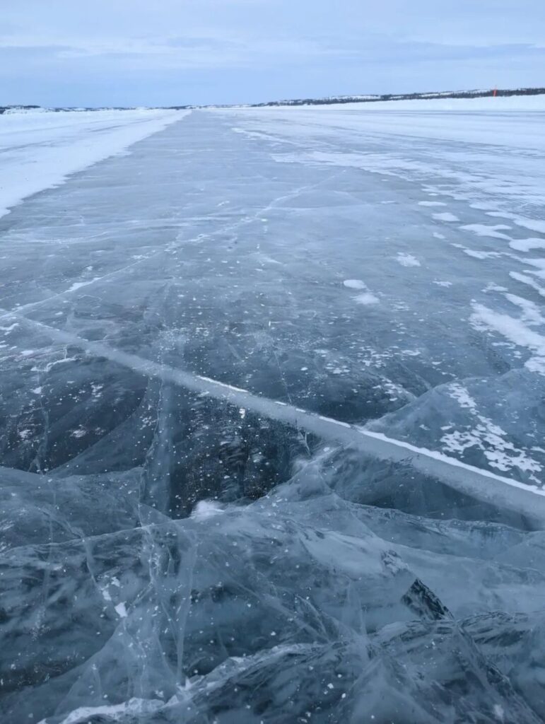 湖面也凍得極其紮實,寬闊的冰面足以承載各類車輛通行。其中有一條把雪鏟乾淨的湖中冰路,冰層厚如巨型玻璃,俯瞰下去,景緻雖談不上驚艷,倒像是層層堆疊的碎晶,帶着各種方向各種深淺的裂縫。據說還有人會去舔那冰塊,當然會把舌頭凍在上面,不知道後面要怎麼取下來。行走其間,偶爾能聽到冰層開裂的悶響。當地人寬慰說,普通的碎裂聲並不可怕,真正令人生畏的是那種像拉開拉鏈一般乾脆利落的長鳴——那是冰面即將徹底崩裂的信號,必須奪路而逃。不過,看見雪還這麼厚氣溫還這麼低,這種擔憂目前顯然是多餘的。