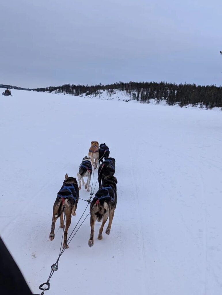 待我到達起點,發現這是那種三人共乘的雪橇,一坐兩站。同乘的是一對來自台灣的情侶,我便先坐着,約定中途再互換位置。起初一切順遂,六隻狗狗在雪地里歡快奔跑,彷彿剛才為上班而哀嚎的是另一群物種。依照導遊建議,我預先戴好護目鏡並用圍巾護住口鼻,奈何兩者間的縫隙仍暴露在外,任由飛濺的雪粒如細針般拍打,寒風像鈍刀反覆切割着皮膚。但我還得注意着前方。六隻狗狗在前方賣力奔跑,而我坐得極低,視線幾乎與它們的尾部齊平。我緊盯着它們,生怕被胯下偶爾排出的『熱騰騰物體』正面擊中(地上到處都有),好在領頭的狗狗不時回頭瞅我一眼,那無辜又專註的眼神倒讓我緊繃的神經稍微放鬆了些。